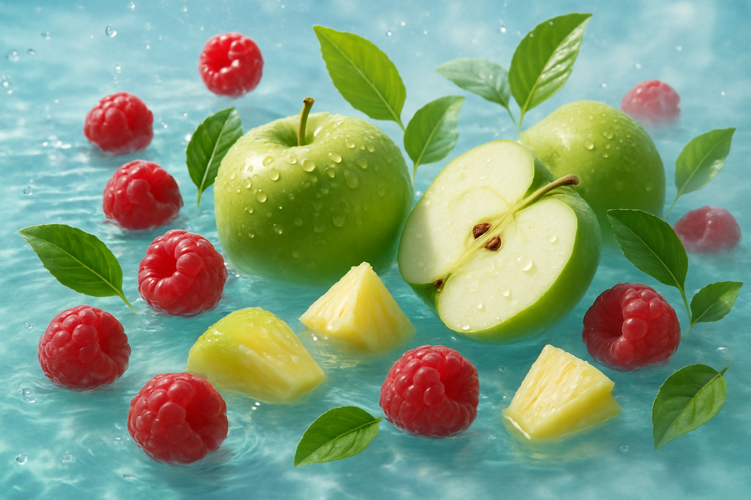 The heart of the fragrance features a fruity and aquatic blend with apple, raspberry, pineapple, and green notes, creating a crisp and uplifting character.